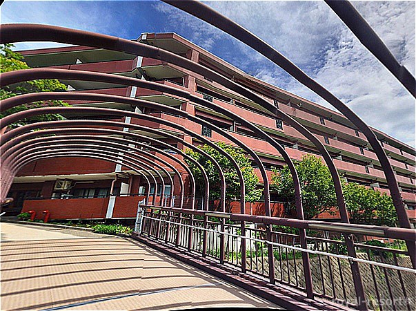 大成建設施工の重厚感ある造りで、建物は斜行エレベーターを挟んで東と西に分かれており館内は内廊下でリゾートホテルのような雰囲気になっています。