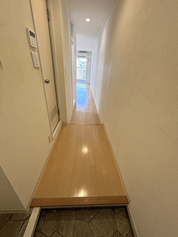 ビーチ沿い国道からすぐ裏の平坦地に建つ「シーサイドレジンデンス」。周辺にはホテルやリゾートマンションが建ち並びます。階段を上がり4階1Kタイプのお部屋。1階奥にあるトランクスペースには空きがあります。
