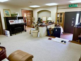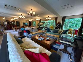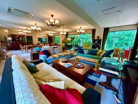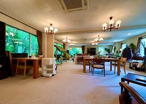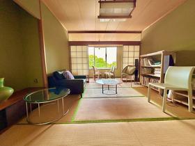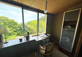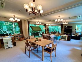住所は熱海市でも最寄駅は「湯河原駅」になります[JR東海道本線「湯河原」駅下車、車約9分(約3.8km)]。1階、玄関前のホールを過ぎ踊り階段を降りると広がるLDK約56.2畳の多目的スペースは、窓一面に緑が美しく映え、静寂閑雅な雰囲気を味わえます。中2階には、男女別に脱衣所・浴場・トイレを完備。2階の廊下には和室が並びます。スリースペースや受付コーナーもあり、セミナーを行える宿泊施設や法人保養所としてのご利用もおすすめです。