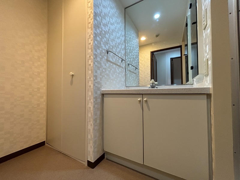 洗面脱衣室。洗面台横の扉は洗濯機置き場です