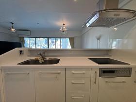 リビングダイニング。バルコニー側からキッチンを眺めた様子