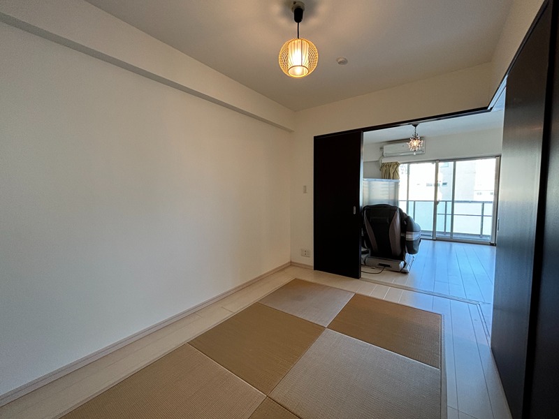 リビングダイニング。バルコニー側からキッチンを眺めた様子