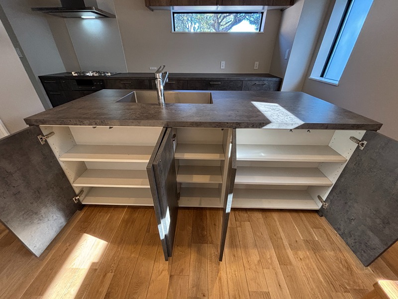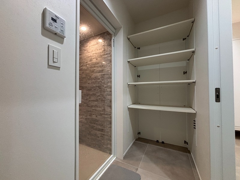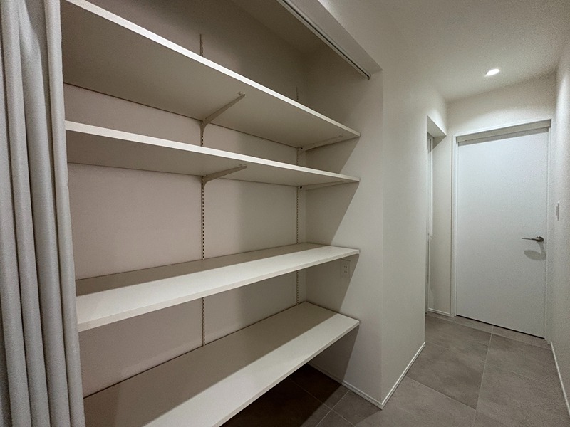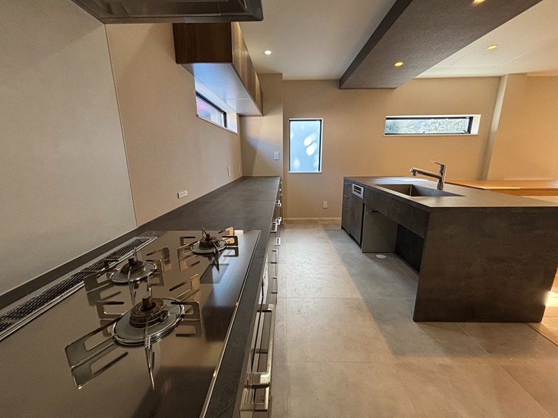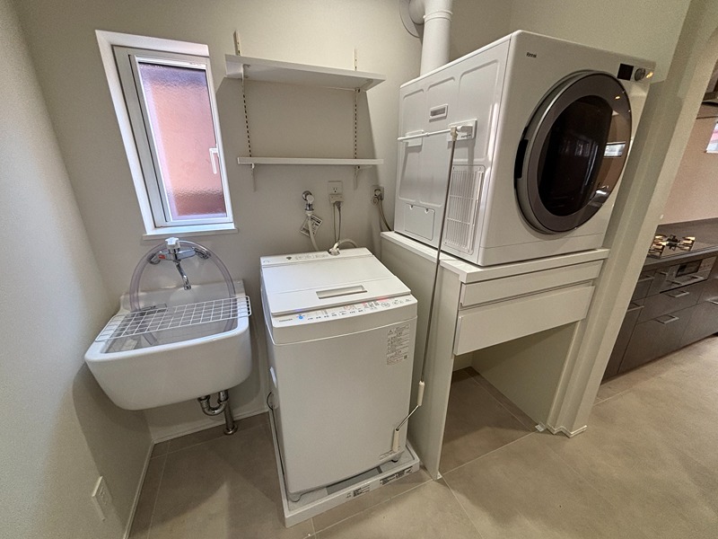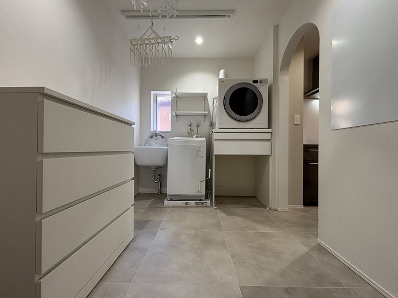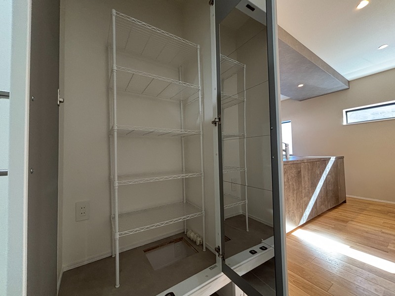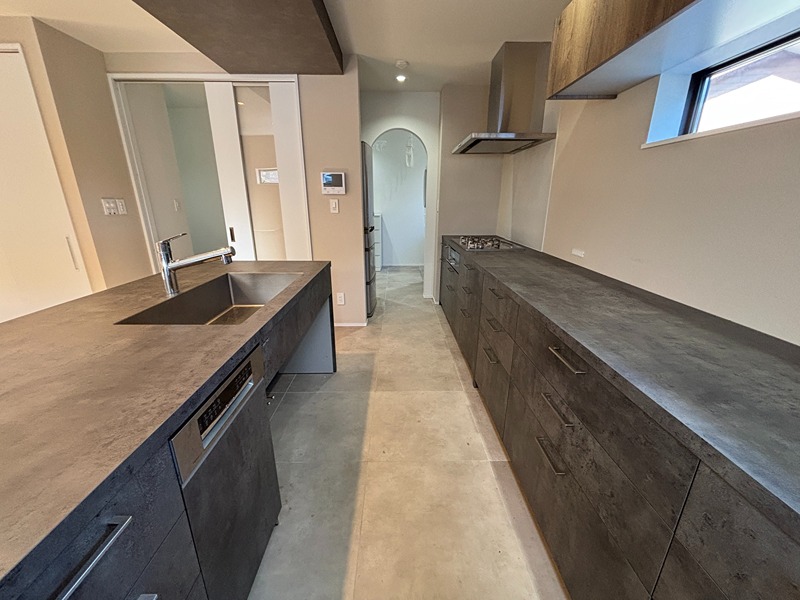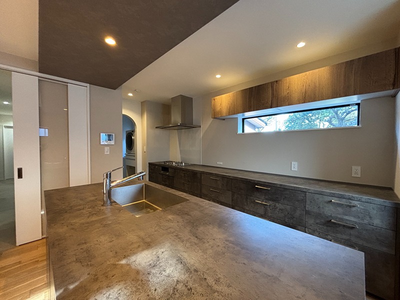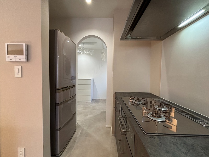 コンロの背面に冷蔵庫置き場があり、死角になるようになっています。奥はランドリースペース