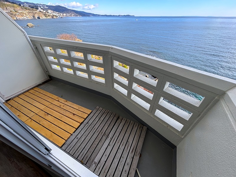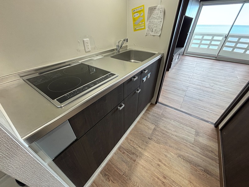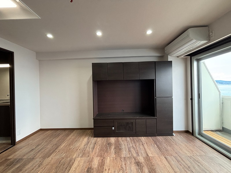 海際に建つ大型リゾートマンション「シャトーテル赤根崎」から、海一望東向き洋室ワンルームタイプが賃貸で登場。シックなブラウンのフローリングに造作棚。グレー色の