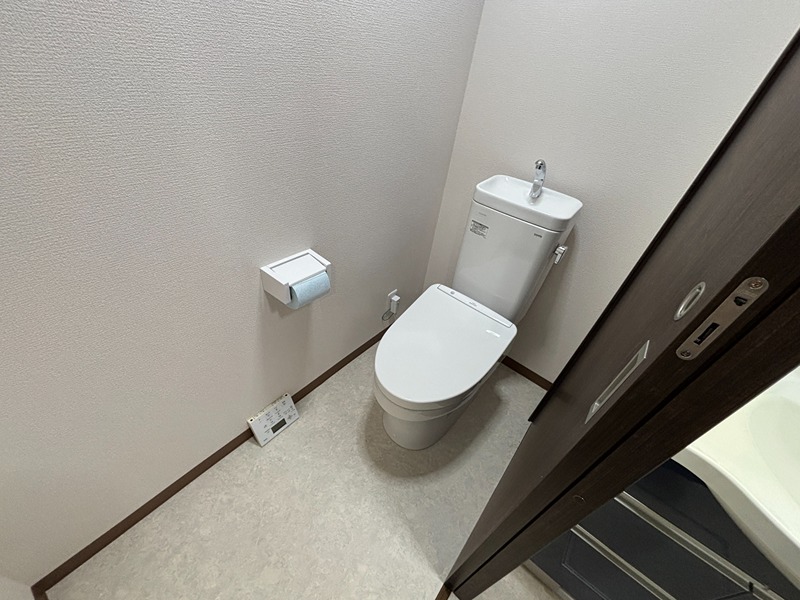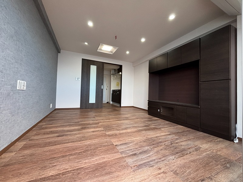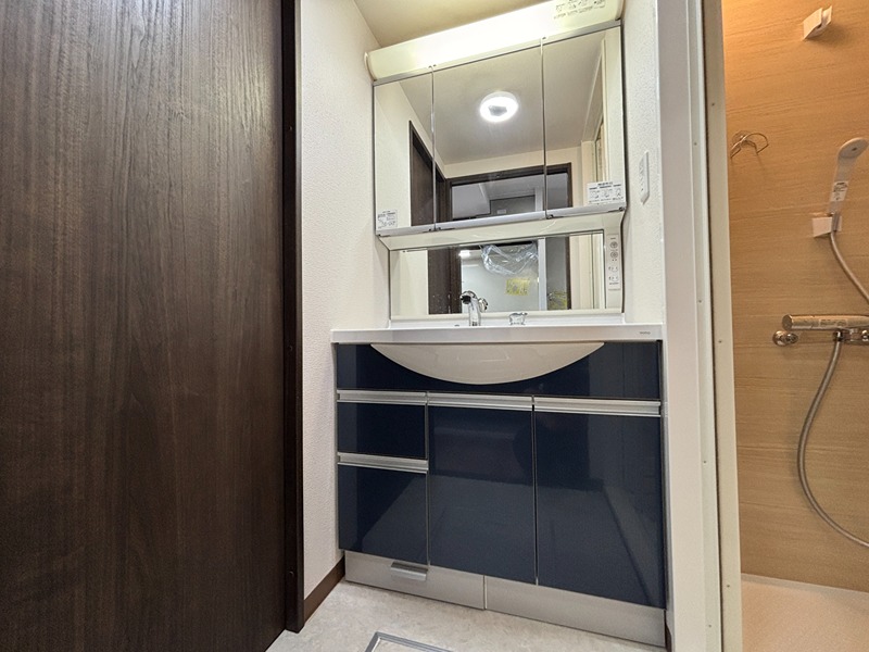 アクセントクロスにダウンライトがとてもおしゃれな造りです。狭い3点ユニットバスを壊し、シャワーブースと洗面台トイレをセパレートに改装しています。また玄関横に洗濯機置場が造られていることもうれしい点です。館内の豊富な共用施設もご利用いただけます。