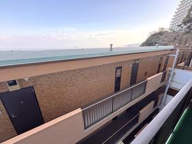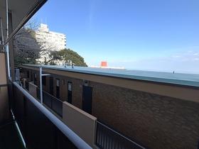 南東向きバルコニーの前方は別棟が見えますが、キラキラ午前の陽が反射する海の水平線は望むことができます。