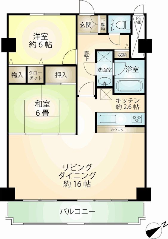□陽当り良好な南東向き住戸