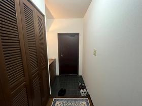 お部屋のご紹介に移っていきます。こちらが玄関。シューボックスが備えられています。