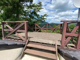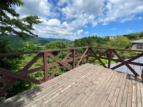 【2階ウッドデッキ】山々の緑がパノラマに広がり心が穏やかになります。