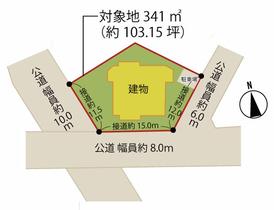 公道、南、幅員:8m、接道長さ:15m、舗装あり、主たる接道 公道、西、幅員:10m、接道長さ:11.5m、舗装あり、主たる接道 |