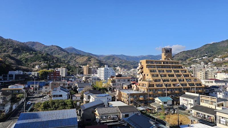 西側のお部屋からの風景です。奥湯河原方面の眺望です。