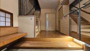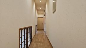 1階の奥の8帖の和室に繋がる名が廊下。照明は人感センサーで点灯します。