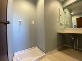 【洗面所】ライトブルーで軽やかな洗面所。洗濯機置場と洗面台を設置。