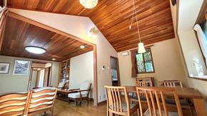 【リビング】一番に目を奪われるのは米杉張りの天井。ダイニングとリビングを天井で仕切ります。