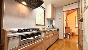 【キッチン】こちらも床暖房完備。広々した間口となっております。背面には造り付けの食器棚もございます。