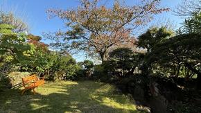 お庭:令和6年12月にお庭を剪定し、海を臨む景色となりました。写真正面に桜が咲き、右側には池付です。