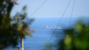 お庭からの眺望(ズーム):真鶴半島のシンボル「三ツ石」も遠くにご覧いただけます。