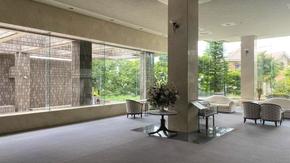 マンションロビー:大きな窓ガラスに外の緑が映えます。