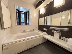 【浴室】出窓がついている広い浴室。戸別温泉付きですのでこちらでも温泉を楽しめます。
