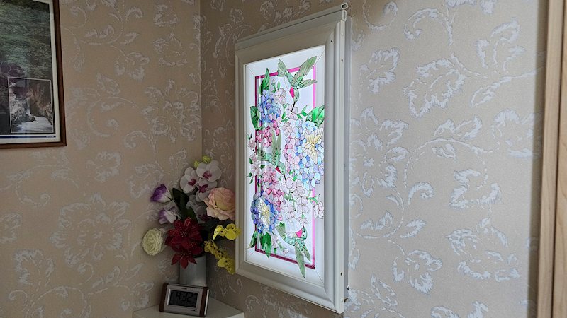 お手洗いの壁は明り取りの開口部があり、ステンドグランス風になっています。
