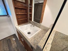 【洗面台】可愛らしいタイル張りの洗面台です。収納力も十分です。