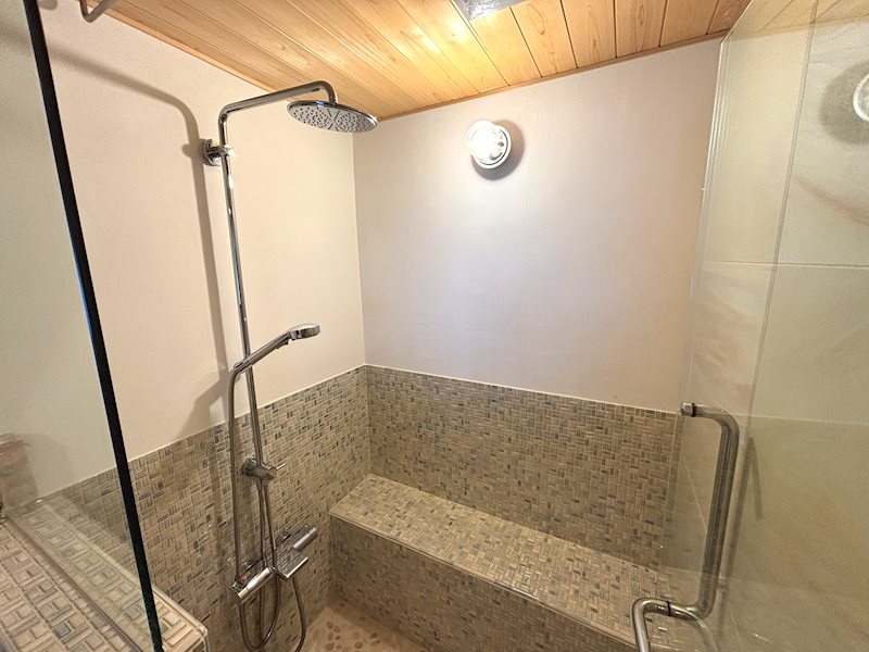 【シャワールーム】浴室乾燥機付きのシャワールーム。タイル張りベンチに腰掛けながらご利用できます。