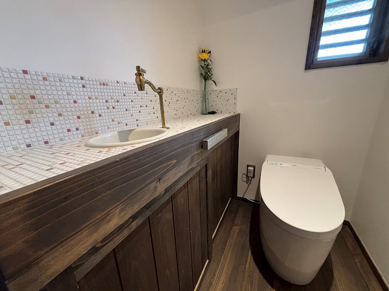 【トイレ】タンクレスタイプのトイレです。可愛らしい、水栓でても洗えます。