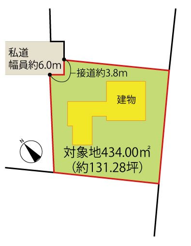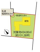 | 主な接道 | 私道、北、幅員:6m、接道長さ:3.8m、舗装あり、主たる接道 | ||