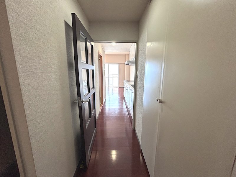 廊下。ライトブラウンのフローリングが好印象な室内。