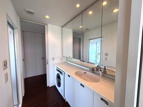 【洗面脱衣室】化粧品や小物などの収納に便利な大型五面鏡。ドラム式洗濯乾燥機を設置。