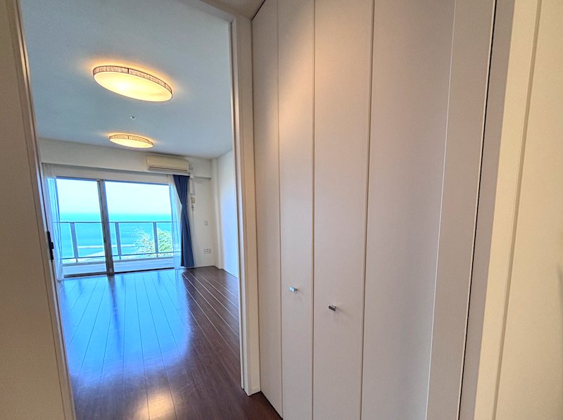 【洋室2】約12.0畳の洋室。バルコニーの奥に紺碧の相模湾が広がる。