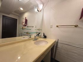 大きい洗面鏡が設置されています。洗面台の横幅も広く二人並んでも使える広さです。