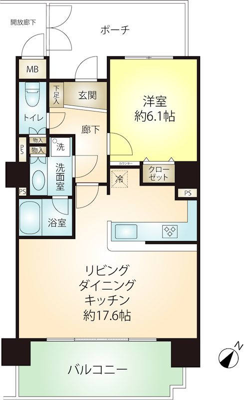 【6階角部屋】高層階角部屋かつ上層階のバルコニー下に当たる位置のお部屋です。