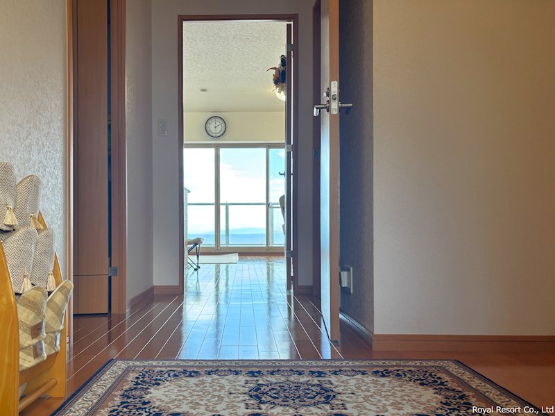 【玄関廊下】玄関扉を開け、室内を進むとすぐに海の景色がのぞきます。