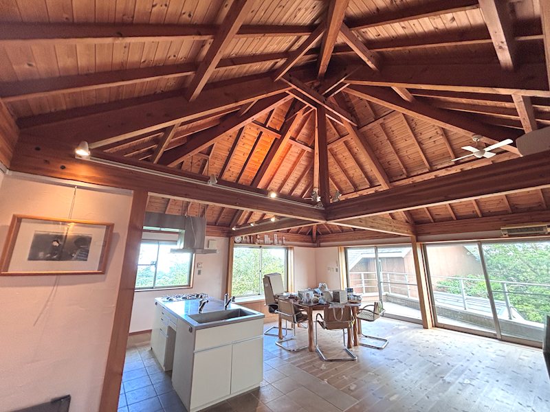 【B棟】2階LDK。梁が露出し屋根の形状がわかる開放的な組木の勾配天井。