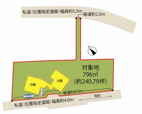 | 主な接道 | 私道、南西、幅員:4m、接道長さ:49m、舗装あり、主たる接道