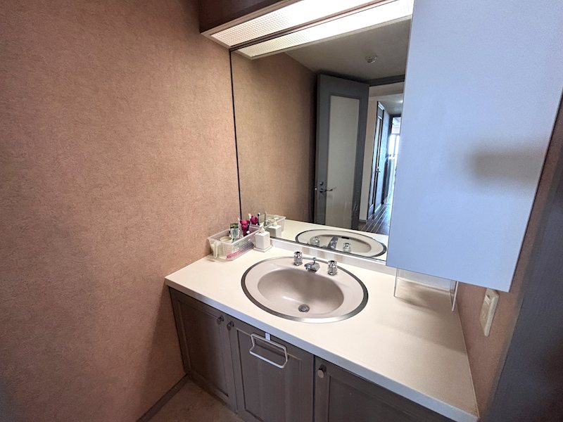 【洗面室】大鏡を設えた洗面化粧台。