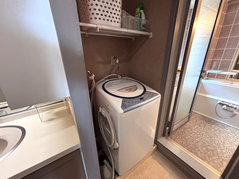 【洗面室】洗面化粧台横に洗濯機置場が設置されております。