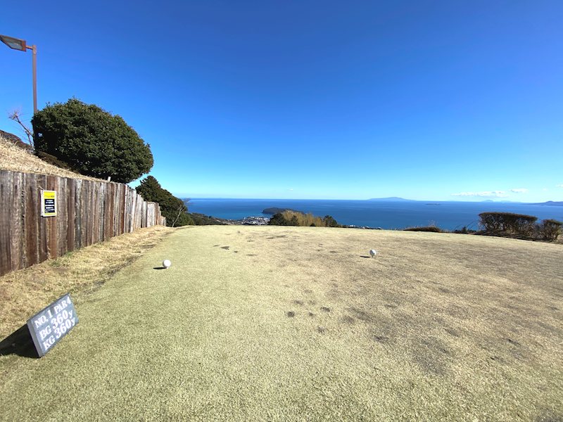 【湯河原カンツリー倶楽部】1番ホールティーグランド。紺碧の相模湾に向かってナイスショット。