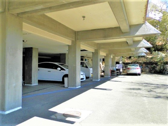 建物の梁を利用した駐車場スペースです。総台数を算出すると8台は充分にお停めいただけます。