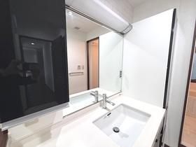 【洗面室】洗面室です。大鏡を設えた化粧台が設置されております。