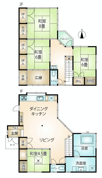 | 設備 | 3口以上コンロ、室内洗濯機置場、洗濯機置場、押入、収納有、2階洗面台、トイレ2ヶ所、トイレ有、バス・トイレ別、バス有、洗面化粧台、玄関ポーチ、床の間、屋外駐車場 | ||