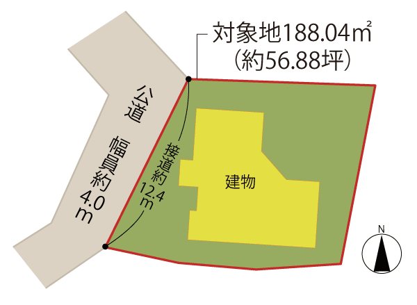 | 主な接道 | 公道、西、幅員:4m、接道長さ:12.4m、舗装あり、主たる接道 | ||