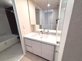 洗面室。三面鏡を採用した洗面化粧台が快適空間を演出。