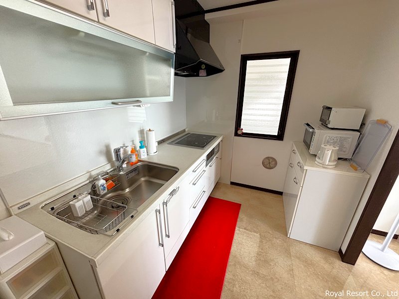 【キッチン】IHキッチンを採用したオール電化です。白い室内に、赤色が映えます。