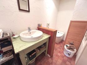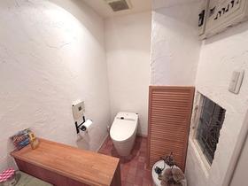 タンクレスタイプのトイレに交換しております。壁にステンドグラスを設えておりますので圧迫感がありません。