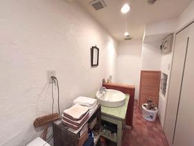 洗面室は間仕切りを取り外し開放的です。壁は漆喰を採用しております。