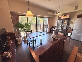 リビングダイニング。茶系のシックな雰囲気を醸し出すフローリング。