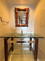 【洗面台】ガラスボウルのホテル仕様な洗面所、全体的に統一された室内です。