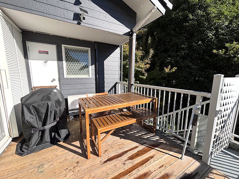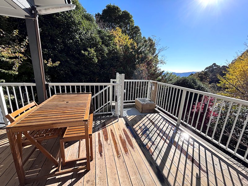 【ウッドデッキ】2階ウッドデッキ。オーナー様が新設。緑に包まれた環境で日々の喧騒を忘れます。